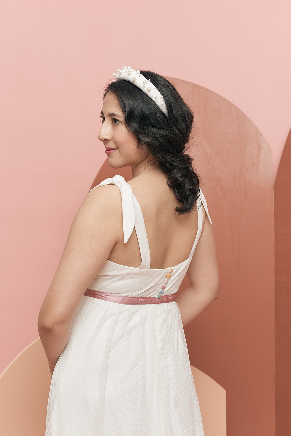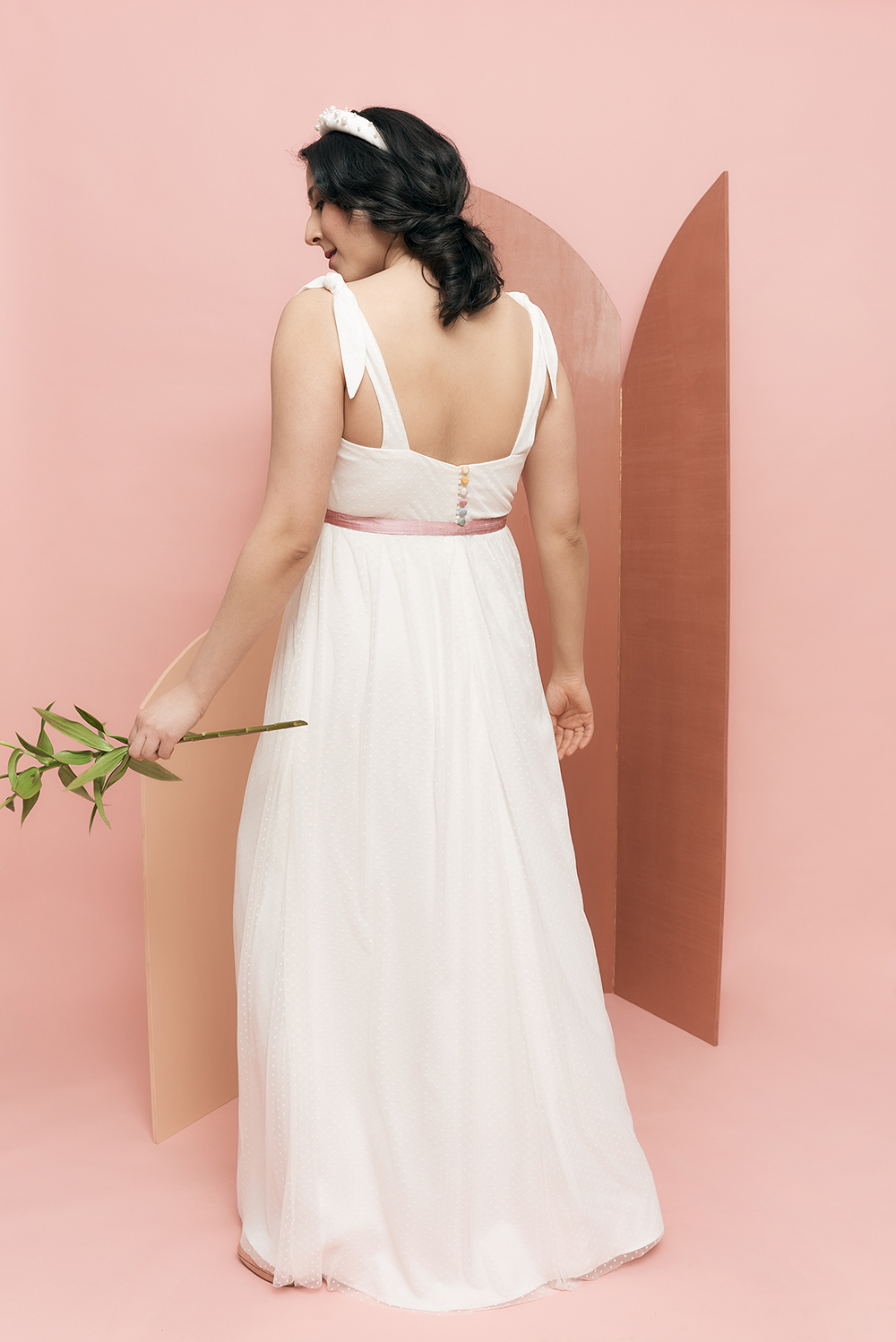 Das Brautkleid Dottie aus Pünktchentüll mit gewickeltem Ausschnitt lässt dich an deinem Hochzeitstag strahlen. Das Kleid ist komplett mit zartem Pünktchentüll gedoppelt, der Ausschnitt besitzt eine Wickeloptik mit eingelegten Falten und an den Schultern sorgen abnehmbare Bänder für einen geknoteten Look. Die Bänder können auch weggelassen werden, um an der Schulter die klare Linie zu erhalten. Auf dem Rücken bilden 6 verschiedenfarbige Seidenknöpfe in Regenbogenoptik einen besonderen Blickfang.