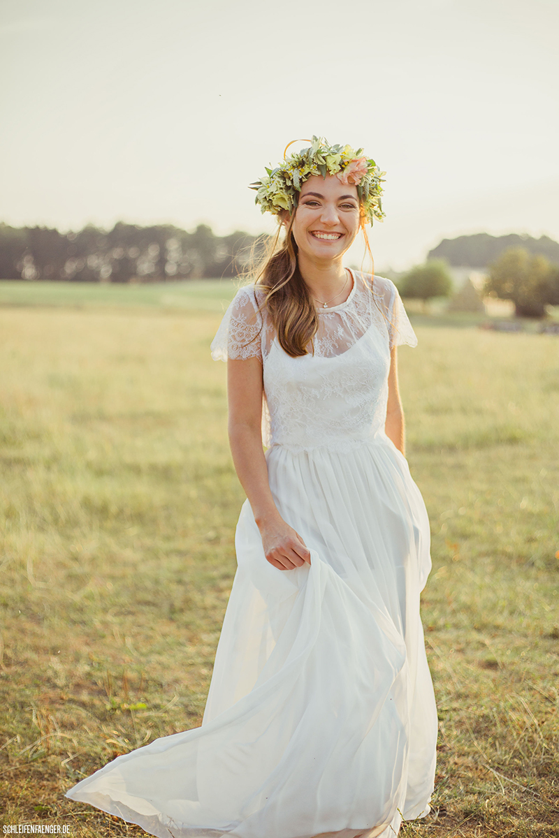 Egal wo du feierst, ob auf dem Bauernhof oder auf dem Schloss, unser schlichtes Emmi Trägerkleid samt Spitzentop wird dich an deinem schönsten Tag begleiten. Zur Party kannst du das Top einfach abwerfen und hast ein leichtes Kleid mit zarten Spaghettiträgern.